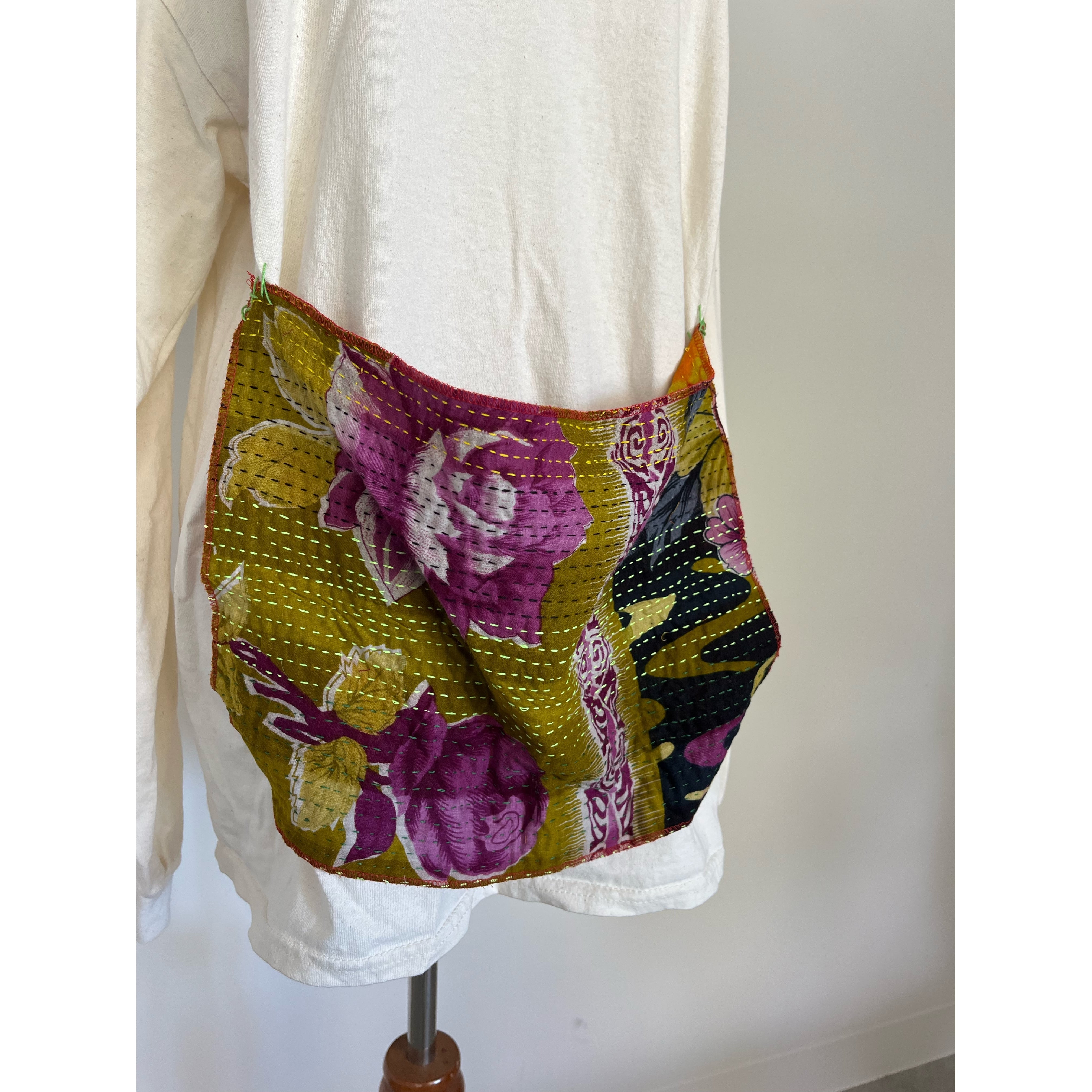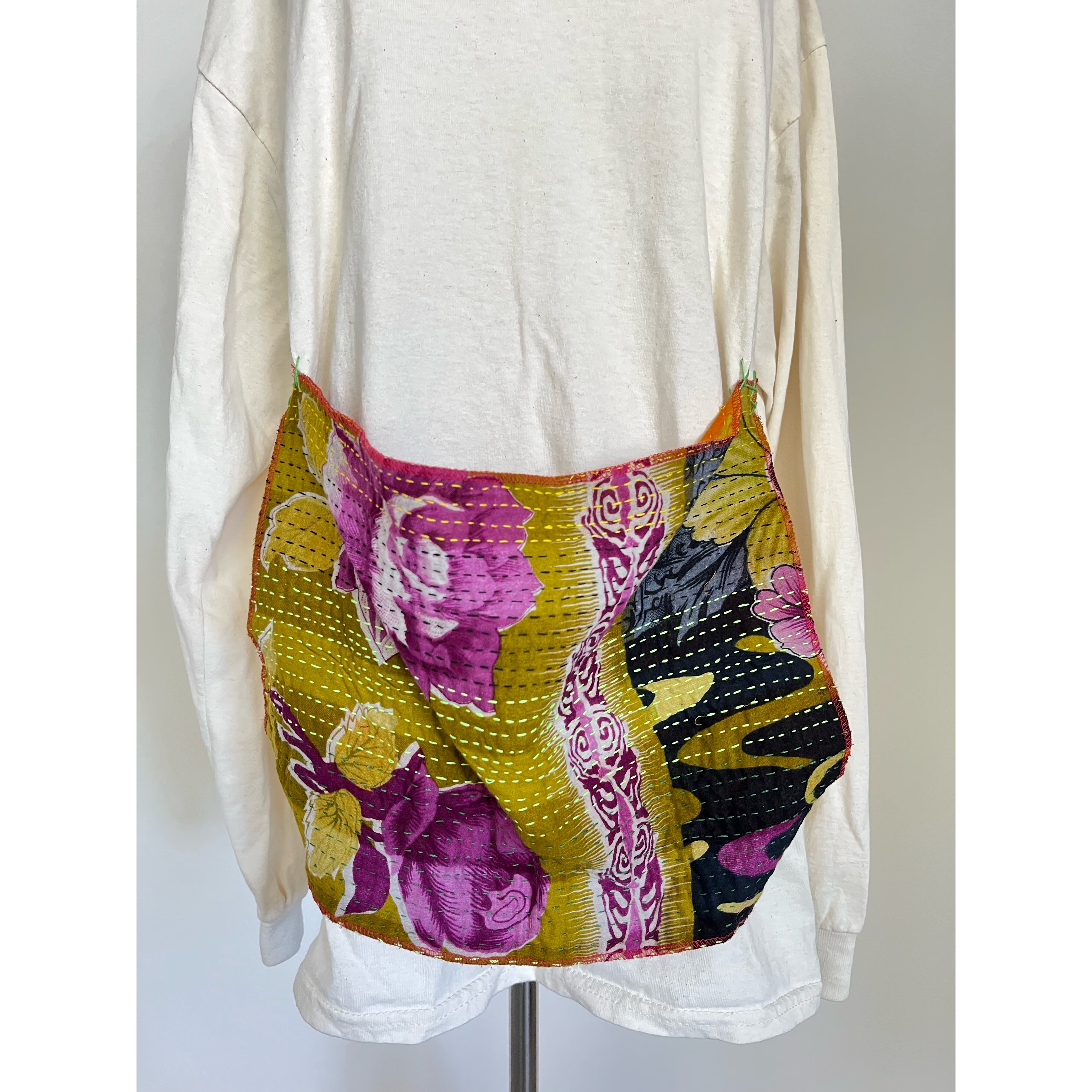 前見頃に大胆にカンタを4点留めしたポケット風の個性的ロンTになります。